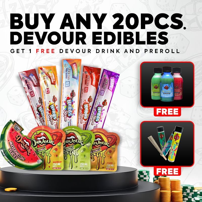 Buy Any 20PCS Devour Edibles – Get 1 FREE Devour Drink and Preroll!